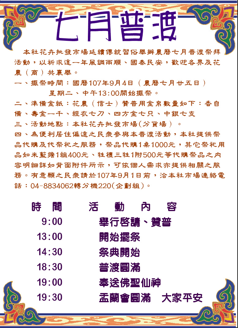 七 月 普 渡 本社花卉批發市場延續傳統習俗舉辦農曆七月普渡祭拜活動,以祈求這一年風調雨順、國泰民安,歡迎各界及花農(商)共襄舉。 一、擺祭時間:國曆107年9月4日(農曆七月廿五日) 星期二、中午13:00開始擺祭。 二、準備金紙:花農(信士)贊普用金帛數量如下:香自備、壽金一千、經衣七刀、四方金七只、中銀七支 三、活動地點:本社花卉批發市場(分貨場)。 四、為便利居住偏遠之民眾參與本普渡活動,本社提供祭品代購及代祭祀之服務,祭品代購1桌1000元,其它祭祀用品如米籃擔1組400元、牲禮三牲1附500元等代購祭品之內容明細詳如背面附件所示,可依個人需求亦提供相關之服務。有意願之民眾請於107年9月1日前,洽本社市場連絡電話:04-8834062轉分機220(企劃組)。